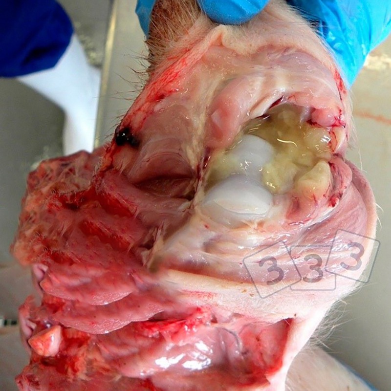 Bệnh tích điển hình các khớp sứng chứa đầy chất dịch màu vàng đến nâu, kèm theo sự dày lên và phù nề của màng hoạt dịch. phì đại nhung mao trên màng hoạt dịch.